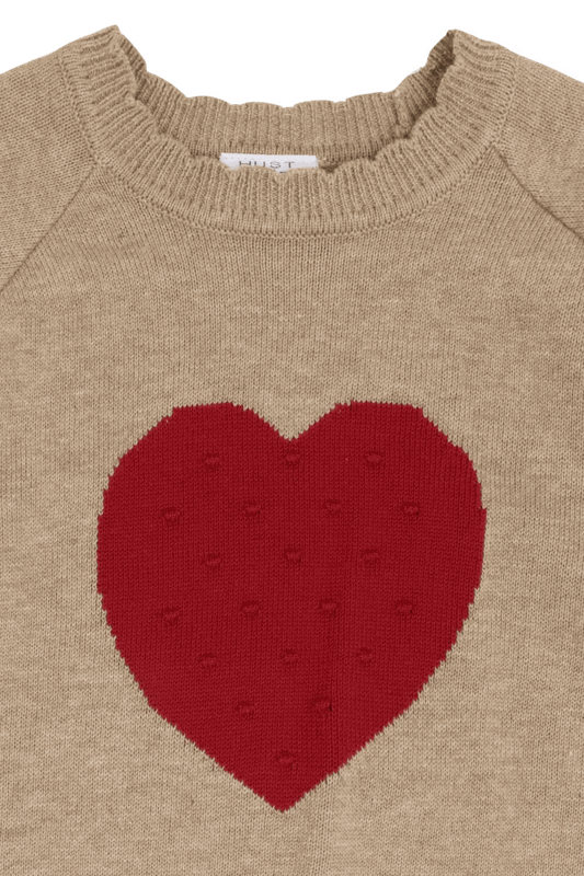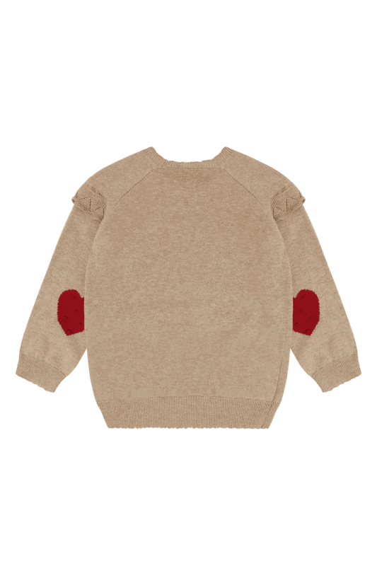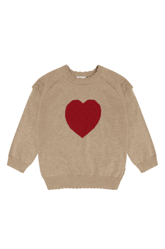 Das süsse Herzmotiv auf der Brust verleiht dem Pullover einen liebevollen Akzent, während zarte Rüschendetails an den Schultern und gewellte Rippbündchen einen charmanten, verspielten Look hinzufügen. Der warme, neutrale Farbton mit einem Hauch von Rot sorgt für ein gemütliches Outfit, das sich ideal für den Alltag, Kindergarten oder festliche Anlässe in den kälteren Monaten eignet.
