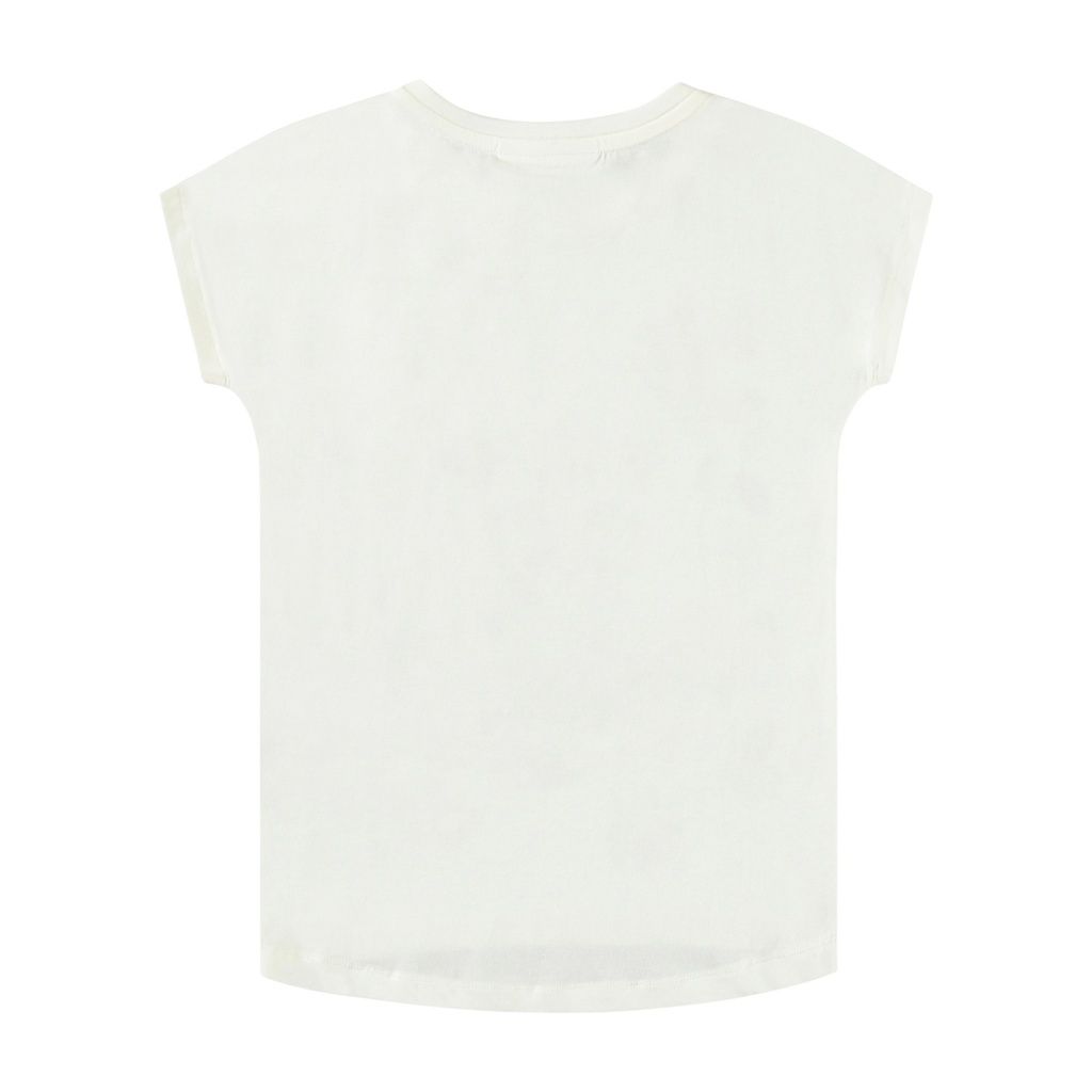 Dehnbares cremefarbenes T-Shirt aus Öko-Baumwolle. Das T-Shirt hat eine normale Passform, kurze Ärmel, gerippten Ausschnitt und ist hinten länger als vorne.