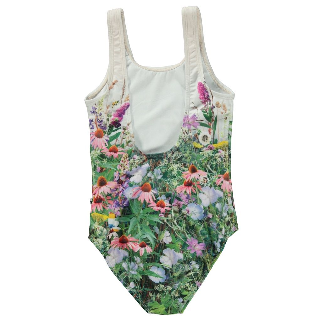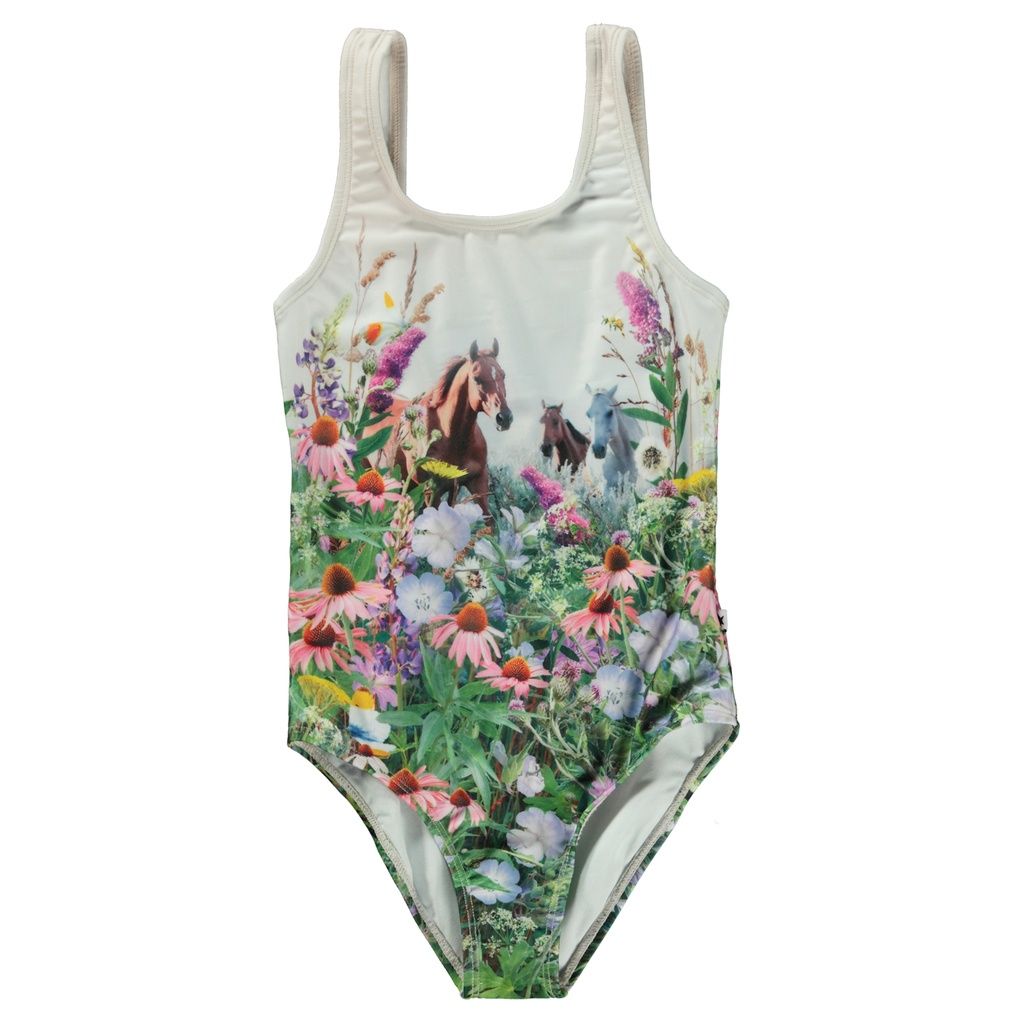 Heller Badeanzug mit rundem Ausschnitt, tiefem Rückenausschnitt und Placement-Aufdruck auf Vorder- und Rückseite, der eine Herde galoppierender Pferde in einem Feld voller Wildblumen zeigt. Er besteht aus recyceltem, elastischem Polyester, wodurch er äusserst bequem und einfach an- und auszuziehen ist.