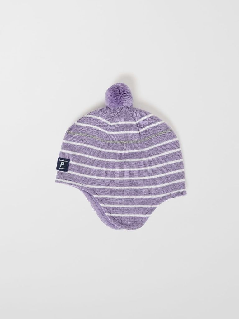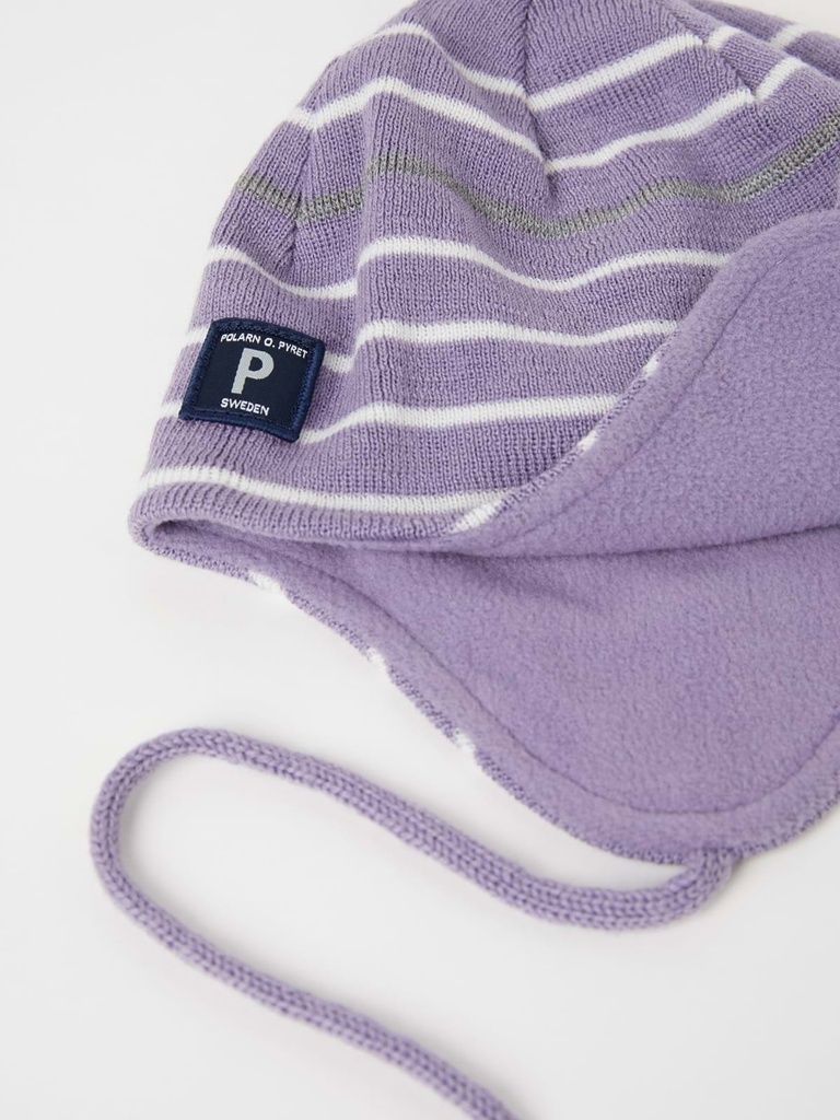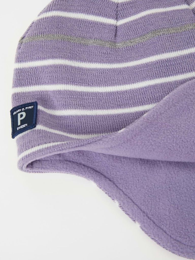 Gestreifte Erstlingsmütze aus wärmendem Wollmix. Die Mütze ist winddicht und reicht bis über die Ohren. Weiches Fleecefutter und reflektierender Streifen, der im Dunkeln für gute Sichtbarkeit sorgt.