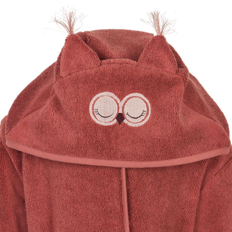 Bademantel aus Bio-Baumwollfrottee mit Bindegürtel in der Taille und aufgesticktem Tiermotiv und angenähten Ohren.