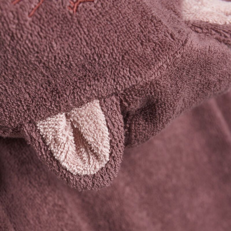 Ein liebevolles Highlight ist die Kapuze in Tierform, die je nach Farbe ein eigenes, verspieltes Design hat und den Bademantel zu einem echten Lieblingsstück macht. Der Mantel wird mit einem Bindegürtel in der Taille geschlossen und sitzt bequem - perfekt für Mädchen und Jungen.
