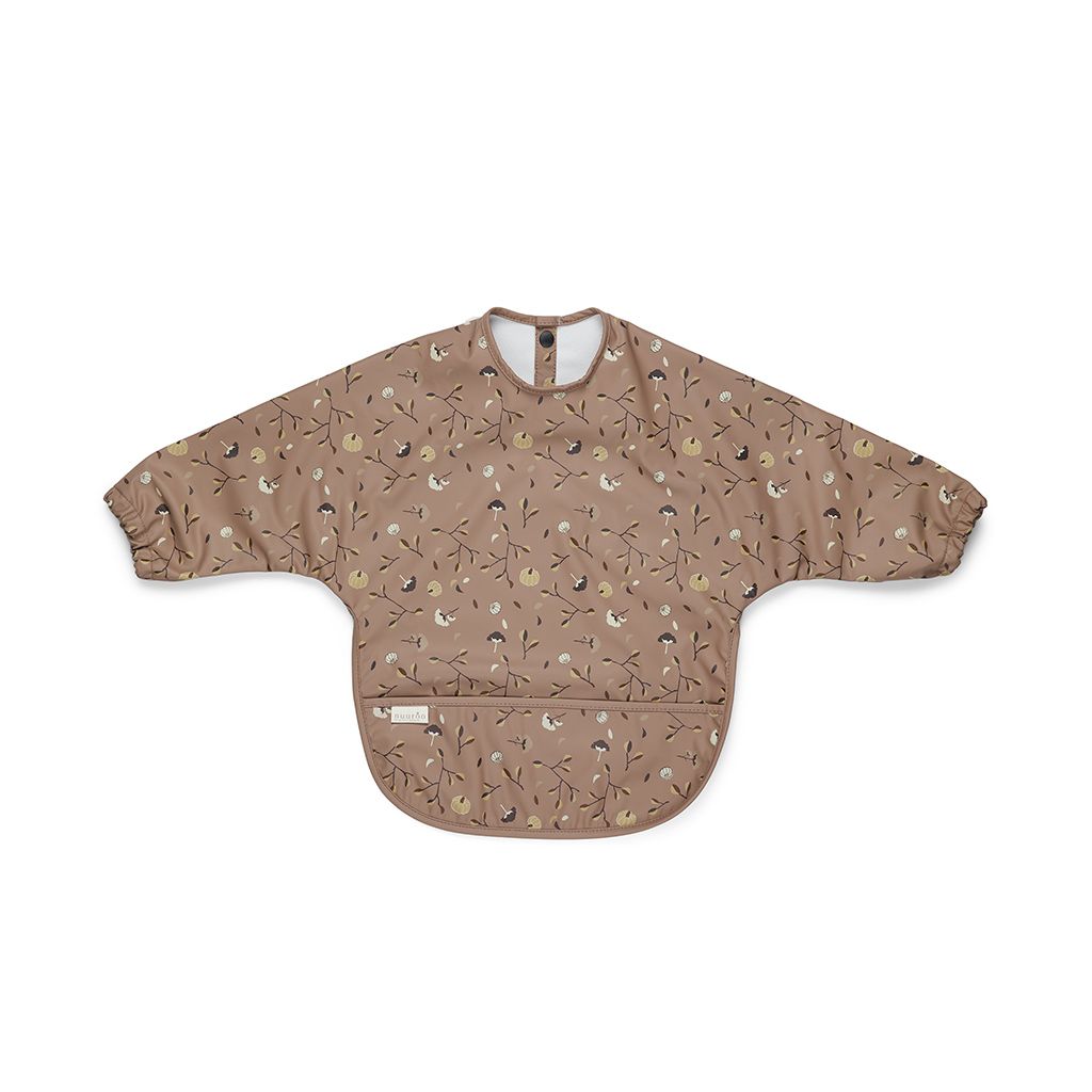Ein plastifiziertes Lätzchen mit Ärmeln schützt die Kleidung von Babys und Kleinkindern beim Essen. Es ist abwischbar und wasserfest, was die Reinigung erleichtert.