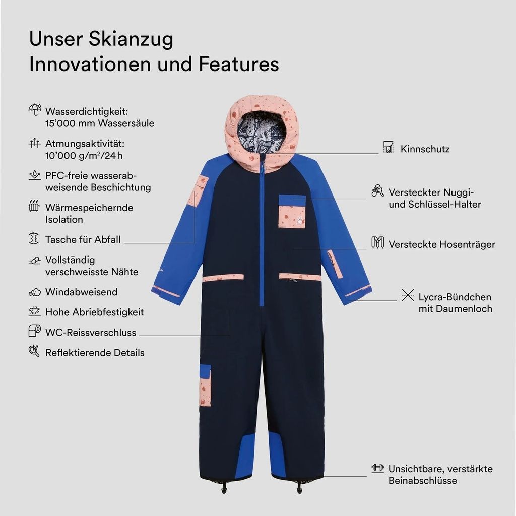 Lass dich von diesem Skianzug auch technisch überzeugen: Er ist wasserdicht mit einer Wassersäule von 15’000 mm, wärmt dank der biologisch abbaubaren* PrimaLoft® Bio™ Fütterung mit 100% rezykliertem Anteil, ist atmungsaktiv mit 10’000 g/m2/24h. Er ist ausgestattet mit einem kindgerechten WC-Reissverschluss sowie Hosenträgern, Abfalltaschen und YKK Reissverschlüssen.
