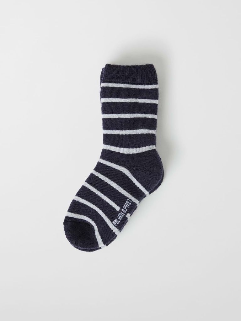 Ein Paar gestreifte Söckchen aus weichem Wollfrottee, der kleine Füsse warm hält. Die Söckchen tragen unsere klassischen Streifen.