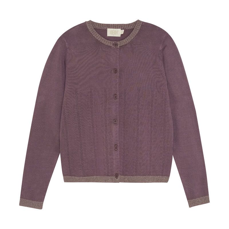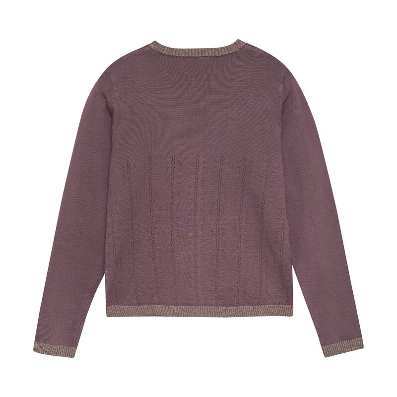 Entzückende Strickjacke mit Pointelle-Muster von Creamie. Das Muster ist transparent und befindet sich auch auf der Rückseite. An allen Öffnungen befinden sich gerippte Kanten mit Goldglitter.