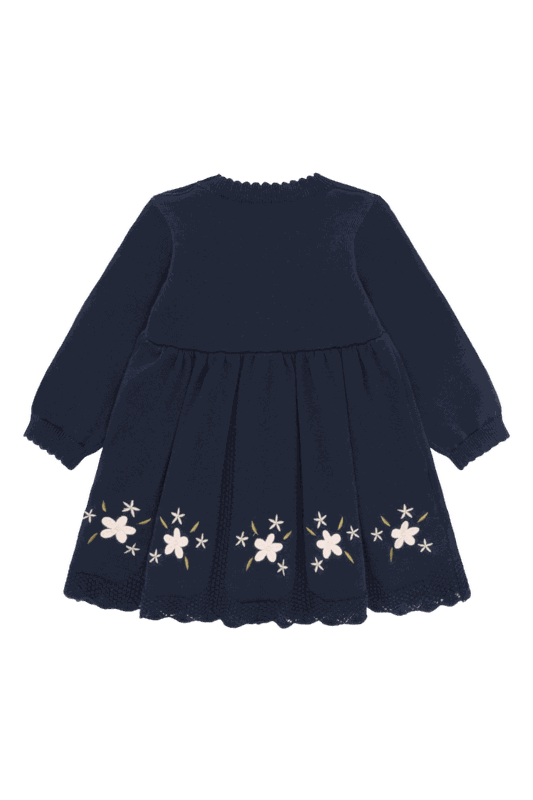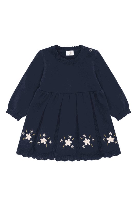 Der Rundhalsausschnitt mit zwei Knöpfen an der Schulter macht das An- und Ausziehen besonders unkompliziert. Durch den ausgestellten Schnitt geniessen Kinder maximale Bewegungsfreiheit beim Spielen, während die liebevollen Blumenstickereien und die verspielten Rippbündchen dem Kleid einen charmanten, mädchenhaften Look verleihen.