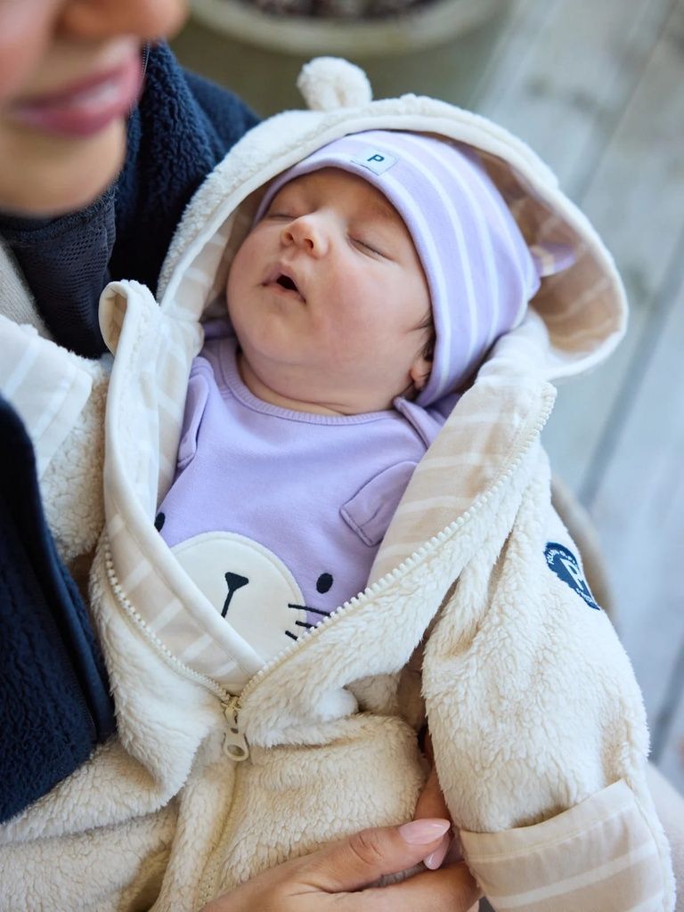einem süssen Kaninchengesicht bestickt und hat weiche Bündchen an den