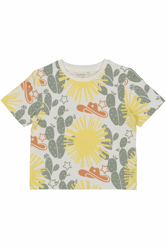 Dieses kurzärmlige Top bringt frischen Wind in die Alltagsgarderobe! Mit seinem fröhlichen All-over-Print sorgt es nicht nur für gute Laune, sondern auch für bewundernde Blicke – ob in der Schule, beim Spielen oder bei einem besonderen Anlass.