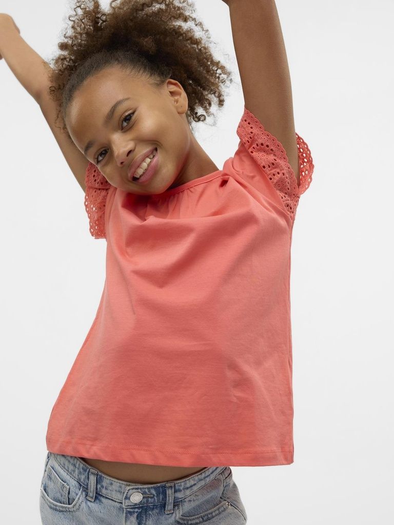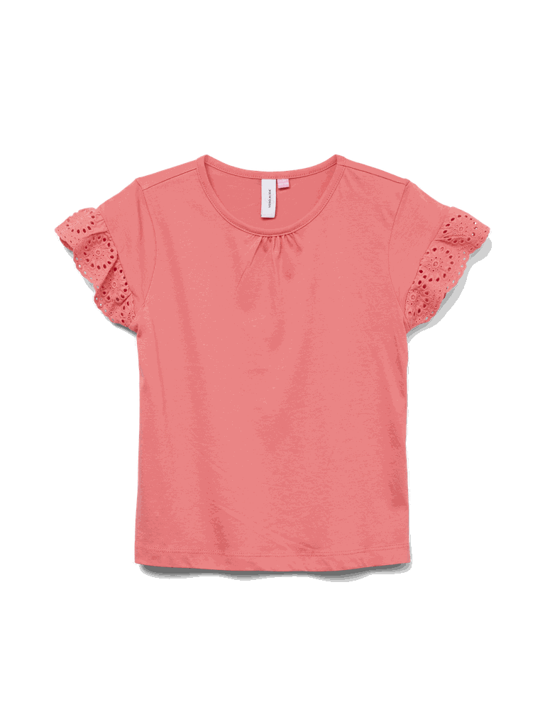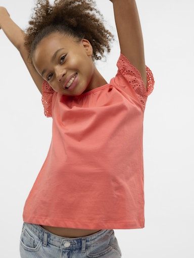 Der Rundhalsausschnitt und die kurzen Ärmel sorgen für angenehmen Tragekomfort und ausreichend Bewegungsfreiheit. Die normale Passform macht es zum idealen Alltagsbegleiter mit einem Hauch verspielter Leichtigkeit – ganz ohne viel Aufwand.