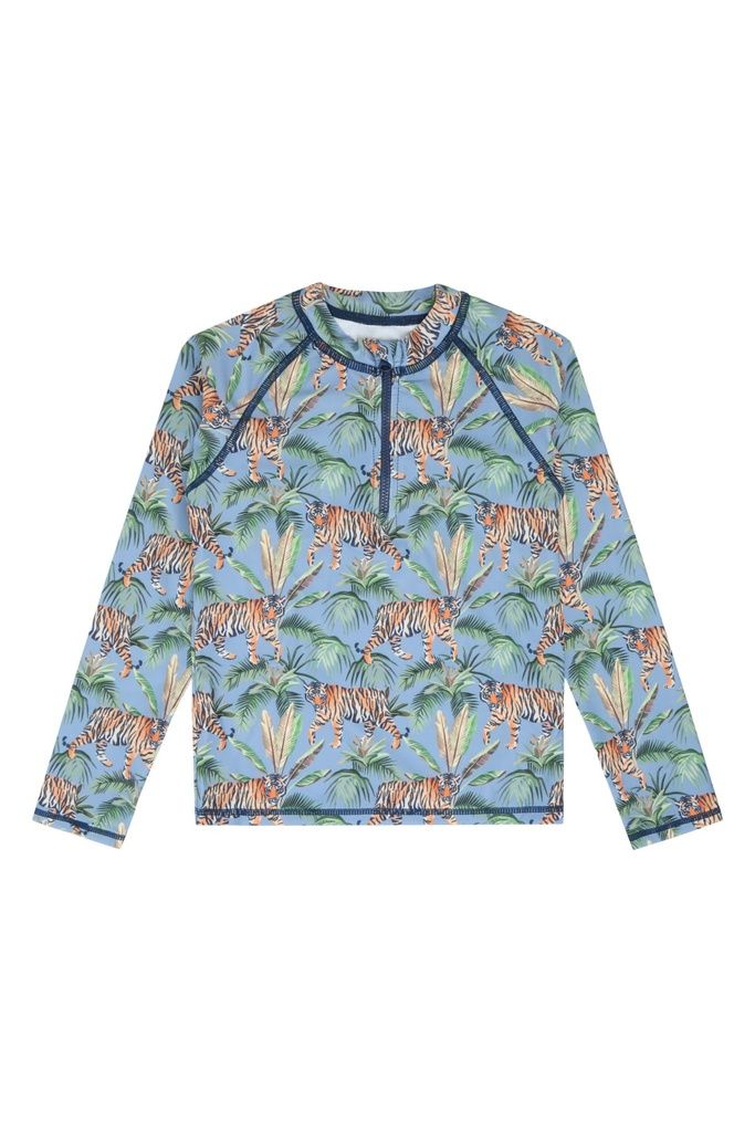 Ein funktionaler Sommerbegleiter mit starkem Look: Dieses Badeshirt von Hust & Claire in kräftigem Blau überzeugt mit einem auffälligen Tiger-Print und durchdachter Ausstattung für sonnige Tage am Wasser.