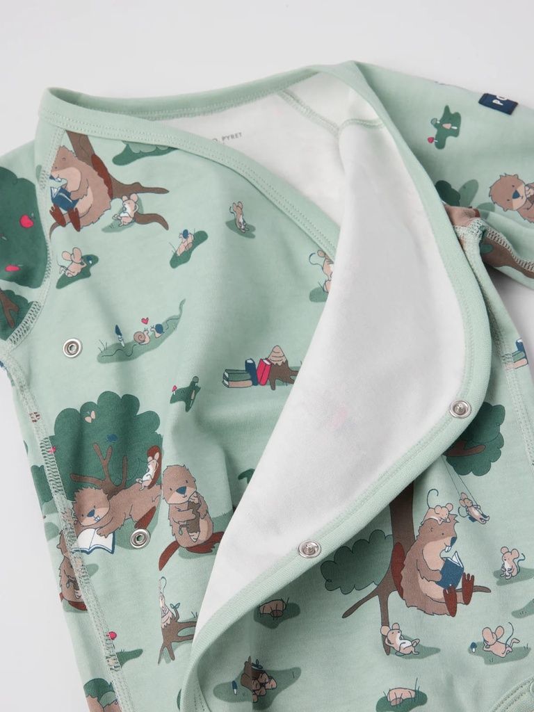 Die Druckknöpfe entlang der Wickelöffnung machen das An- und Ausziehen besonders einfach, während extra weiche, flache Nähte sanft zu empfindlicher Haut sind.