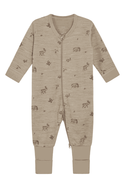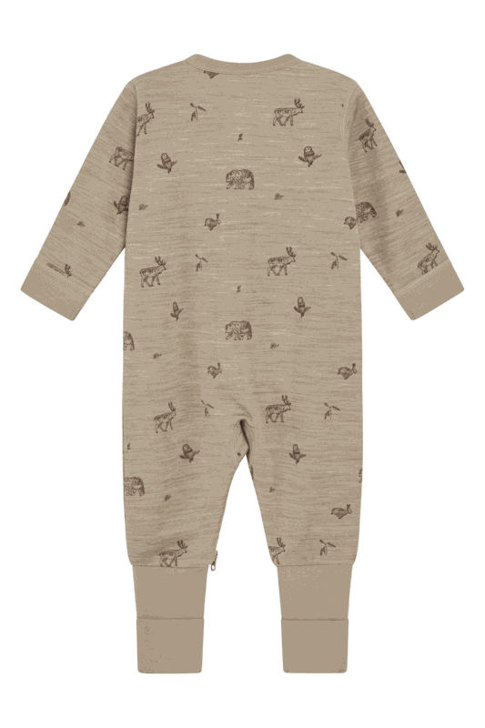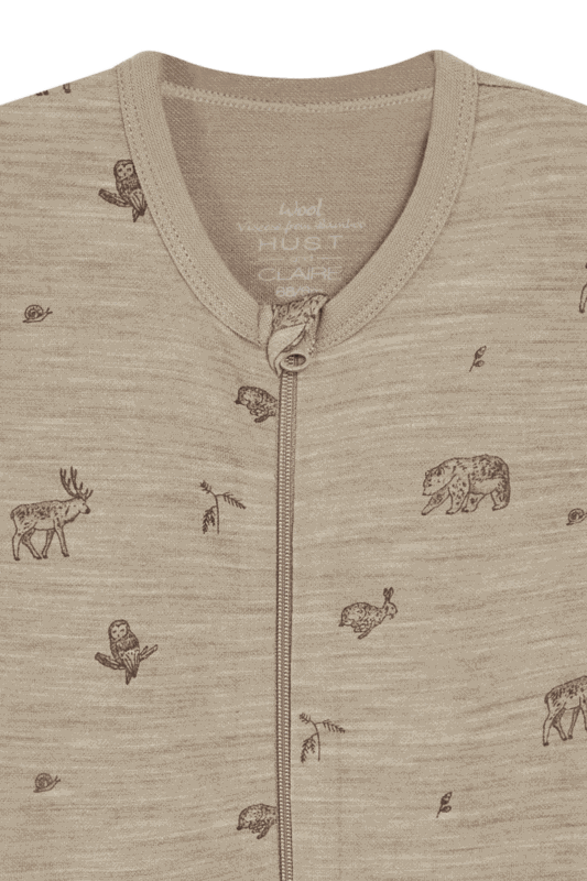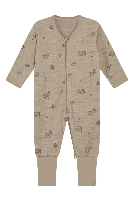 Langärmeliger Einteiler aus angenehmer, dehnbarer Wolle und Bambusviskose mit einem Tierprint. Dieser Einteiler wird mit einem Zweiwege-Reissverschluss geschlossen, der über den Bauch und zum linken Fuss verläuft.